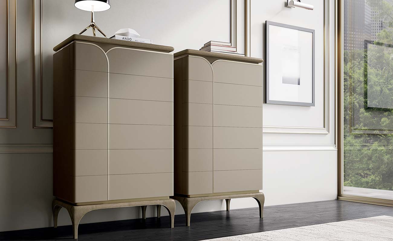 Gli stessi stilemi che danno lustro all'area relax, si traducono, nella zona notte in elementi di vero lusso, per il riposo di persone che mai danno riposo alle loro aspettative estetiche, che pretendono per sé il meglio anche negli spazi e nei momenti più privati. La base del letto si impreziosisce con la lavorazione a coste vista negli imbottiti. Le ante in essenza del comò ornano anche i comodini, comò, settimino e toilette.